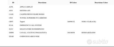 ABS, Airbag, Airbag Passeggero, Alzacristalli elettrici, Android Auto, Antifurto, Apple CarPlay, Autoradio, Autoradio digitale, Bluetooth, Boardcomputer, Bracciolo, Cerchi in lega, Certificato della batteria, Chiusura centralizzata, Chiusura centralizzata telecomandata, Climatizzatore, Climatizzatore automatico, 2 zone, Controllo automatico clima, Controllo trazione, Controllo vocale, Cronologia tagliandi, Cruise Control, ESP, Fari bi-Xeno, Fari full-LED, Frenata d'emergenza assistita, Freno di stazionamento elettrico, Immobilizzatore elettronico, Interni in pelle, Leve al volante, Luci diurne LED, Monitoraggio pressione pneumatici, Pacchetto sportivo, Park Distance Control, Regolazione elettrica sedili, Sedili sportivi, Sensori di parcheggio anteriori, Sensori di parcheggio posteriori, Servosterzo, Sistema di navigazione, Sospensioni pneumatiche, Sospensioni sportive, Specchietti laterali elettrici, Spoiler, Start/Stop Automatico, Streaming musicale integrato, Supporto lombare, Tettuccio apribile, Touch screen, USB, Vivavoce, Volante in pelle, Volante multifunzione