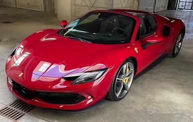 Ferrari 296 GTS rosso mugello, interni in pelle nera, sedili full electric in pelle ed alcantara nera, cuciture bordeaux, cavallino sul poggiatesta, cinture bordeaux, colonnette ruota in titanio, cerchi forgiati diamantati opachi, volante in carbonio con leds, pinze freni giallo modena, scudetti scuderia Ferrari sui parafanghi, pellicola trasparente sulla parte anteriore, cofano,parafanghi e specchietti.