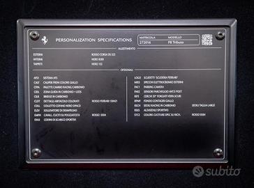 [Cod: 1089047-806] [Veicolo: FERRARIF8CG77] Prezzo Gruppo Carmeli: 329.900,00 € Con Promo Gruppo Carmeli: 319.900,00 € (offerta valida con sottoscrizione dei servizi finanziari e assicurativi Gruppo Carmeli, escluso gli oneri finanziari) FERRARI F8 Tributo-ITALIANA-IVA ESPOSTA-SEDILI RACING-VOLANTE CARBONIO IMMATRICOLAZIONE: 01-02-2022 KW: 530 CV: 720 KM: 8.700 COLORE ESTERNO: ROSSO CORSA DS 322 INTERNI: SEDILI RACING CARBONIO TAGLIA LARGE / INTERNI 8500 OPTIONAL: - (AFS1) SISTEMA AFS - (CALY) CALIPER FRENI COLORE GIALLO - (CFPA) PALETTE CAMBIO RACING CARBONIO - (CIDL) ZONA GUIDA IN CARBONIO + LEDS - (CILR) BRIDGE IN CARBONIO - (CLDT) DETTAGLI ABITACOLO COLORATI ROSSO FERRARI 130421 - (COLL) COLLETTO COFANO NERO OPACO - (ELEV) SOLLEVATORE DI DISIMPEGNO - (EMPH) CAVALL. CUCITI SU POGGIATESTA ROSSO 0504 - (EXA3) CODINI SCARICO SPORTIVI - (LOGO) SCUDETTI SCUDERIA FERRARI - (MIR3) SPECCHI ELETTROCROMICI ESTERNI - (PAC1) PARKING CAMERA - (PAR2) SENSORI PARCHEGGIO ANT. E POST. - (RIFS) CERCHI 20" FORGIATI VERN.SCURI - (RPMY) FONDO CONTAGIRI GIALLO - (RSCH) SEDILI RACING IN CARBONIO SEDILI TAGLIA LARGE - (RSES) ALZASEDILE SPORTIVO - (STC2) COLORE CUCITURE SPEC SU RICHIESTA ROSSO 0504 VETTURA CON IVA ESPOSTA - TAGLIANDI UFFICIALI Equipaggiamenti di serie: - ASR /Anti-Slip Regulation - Abs - Airbag frontali - Airbag laterali - Ammortizzatori Magnaride - Antifurto - Cambio automatico - Cerchi in lega da 20 - Climatizzatore automatico a due zone - Fari a Led - Fari automatici - Freni carboceramici - Impianto audio con radio digitale DAB - Indicatore pressione pneumatici - Keyless system - Kit riparazione pneumatici / tirefit - Pulsante di avviamento - SSC 6 - Sospensioni...[Cod: 1089047-806] [Veicolo: FERRARIF8CG77]