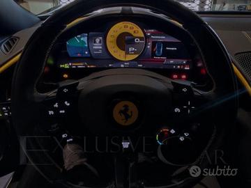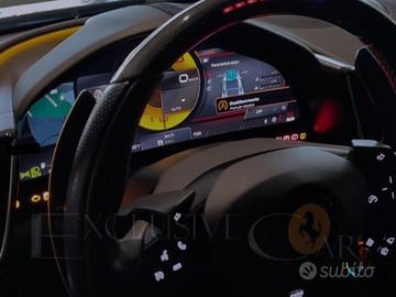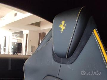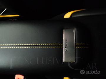Esemplare configurato Atelier con vernice Nero Stellato, interni in pelle nera con cuciture e dettagli giallo Modena extracampionario, volante in carbonio con LED, e finiture in carbonio dedicate.