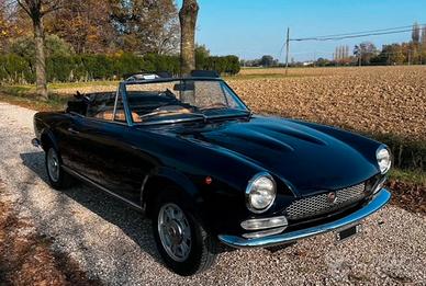 Bellissima Fiat 124 Sport Spider 1800 del 1973, la versione più rara e ricercata, nell’elegante colore Blu Scuro Fiat con interni nocciola e capote nera.
