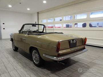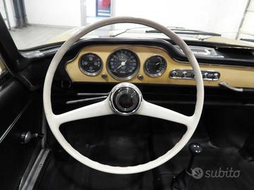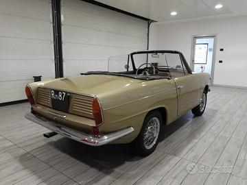 Sedili e pannelli in sky nero, Volante a due razze, Cruscotto in legno, Antifurto meccanico con chiave blocco leva cambio accessorio di periodo, Specchio esterno lato guida cromato, Capotte in tela nera, Cerchi a raggi Borrani cromati con gallettone cromato con pneumatici 115/70 R13, Hard top