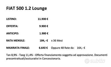 Splendida FIAT 500 1.2 Unico Proprietario Optional: Tettuccio panoramico Comandi al volante Radio cd MP3 Climatizzatore Bluetooth Vivavoce Aux/Usb Volante in Pelle Il programma di garanzia comprende: 100 controlli di qualità Tagliando pre-consegna Attestazione stato d'uso delle parti meccaniche Attestazione esecuzione a regola d'arte dei ripristini di carrozzeria Certificazione percorrenza chilometrica Trasparenza storia manutentiva curriculum vitae vettura Copertura totale delle parti meccaniche ed elettroniche Costo della manodopera dell'Assistenza FIAT sempre incluso Pacchetto Assistenza Mobilo valido in tutta Europa Finanziamento agevolato in 84 rate ........ ZERO-anticipo Zero-maxirata finale in offerta speciale per possessori di rottamazione. PRONTA CONSEGNA