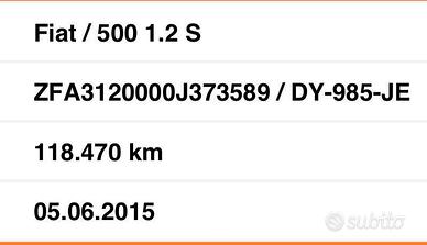 ULTIMA FOTO ( una parte della nostra fattura d'acquisto ) :ALLESTIMENTO-TELAIO - TARGA ESTERA ( FRANCIA ) - KM - ANNO D'IMMATRICOLAZIONE IDEALE PER NEOPATENTATI FIAT 500 cc1.2 benzina SPORT 70 CV , FULL OPTIONAL , GIUGNO2015 con soli 118540 km cambio manuale a 5 marce ALLESTIMENTO SPORT : NAVIGATORE SCHERMO GRANDE CAR PLAY - CLIMA - FARETTI FENDINEBBIA - PARAURTI SPORTIVI - VOLANTE SPORT - INTERNI IN TESSURTO BICOLORE ( rifiniture rosse ) BATTERIA NUOVA MESSA IL 01/04/2026 DUE CHIAVI - RUOTA DI SCORTA Ottime condizioni generali interne, esterne e meccaniche. Garanzia e possibilita' di finanziamenti agevolati. Si valutano permute L'auto è disponibile a Sommatino ( CL ) in viale Fontaine10( vicino la caserma dei carabinieri ) per qualsiasi vostra prova e controlloanche con meccanico di vostra fiducia . Non esitate a contattarmi per qualsiasialtra informazione alla mia email o direttamente al mio cellulare anchewhatsapp PREZZO 7300 euro con GARANZIA INCLUSA conformgest per 1 anno- PASSAGGIO DI PROPRIETA' ESCLUSO