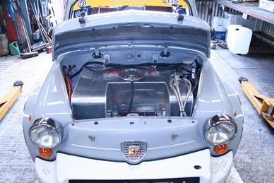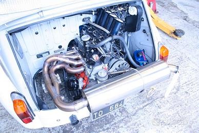 Mossa da un motore Abarth A112 preparato per le competizioni, che eroga circa 130 CV, abbinato a un raro cambio Colotti a 5 marce e a un sistema di iniezione elettronica. Caratteristiche principali Motore: A112 Abarth – preparato per le competizioni (130 CV) Trasmissione: cambio Colotti a 5 rapporti Alimentazione: sistema di iniezione con circuito carburante personalizzato Freni: 4 freni a disco Sospensioni: sospensioni anteriori indipendenti con ammortizzatori a ghiera regolabile Raffreddamento: radiatore anteriore Interni e dotazioni Cruscotto in stile Abarth Sedili in stile Abarth Volante Abarth Supporto ginocchia Abarth Roll-bar Sparco Serbatoio carburante da competizione con installazione completa Esterni e telaio Cerchi Cromodora/Campagnolo Costruita secondo le specifiche Abarth 1000 TCR Storia Competizioni in cronoscalata in: Germania Belgio Paesi Bassi Italia (Vernasca Silver Flag) Regno Unito Veicolo immatricolato e omologato per la circolazione nel Regno Unito Fornita con documenti FIA e FIVA