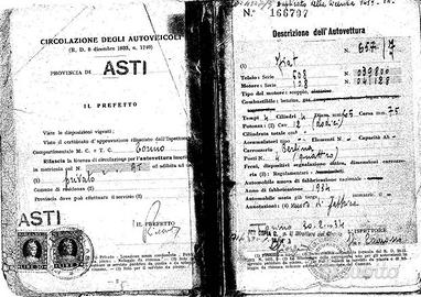 Fiat Balilla 508 Prima Serie Berlina 2 Porte 3 Marce Motore Serie 108 Libretto Originale. Targata Asti con le sue Originali in Sfondo Nero Immatricolata il 30 Febbraio 1934 38617Km Ultima Revisione Effettuata a Luglio 2011 Appartenuta a Proprietario da più di Dieci anni, Tenuta al Chiuso Solamente per Esposizione di Rappresentanza in una Ditta del Canavese. Ideale come Forma di Investimento, con Sicuro Incremento di Valore nel Tempo. Vettura Restaurata, Completamente Funzionante. Bollo Esente e Polizza Assicurativa Agevolata. Per info 366.703.10.59 Se necessario siamo disponibili a venire a prendervi alla più vicina stazione ferroviaria o aereoportuale. Per eventuali informazioni non esitate a contattarci. Ricordiamo che al fine di evitare inconvenienti, eventuali inesattezze relative all'annuncio e per la massima trasparenza è consigliabile accertarsi della disponibilità dell'autovettura e della correttezza dei dati inseriti. MY CAR Compravendita Auto Multimarca DEPOSITO: Corso Nazioni Unite, 72 10073 Ciriè (TO) Cel. 366.703.10.59 E-mail: my_car@live.it Pec: my_car@pec.it P:IVA 09403540017 REA: TO-1062682