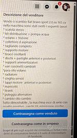 Ciao a tutti Vendo o scambio fiat bravo sport 2.0 ex 165 cv nella macchina sono stati svolti i seguenti lavori * kit distribuzione + pompa acqua *scatola sterzo * volano + frizione * collettore d aspirazione * tagliando completo * supporto motore * bracci oscillanti * dischi + pastiglie anteriori e posteriori * supporti ammortizzatori * vari cuscinetti cambiati *para olio volano * radiatore *sostituzione liquido di raffreddamento * cinghia servizi * tappi motore anteriori e posteriori * manicotti * tiranti * puleggia alternatore * cambio olio cambio Tutto dimostrabile , la macchina esce di serie con assetto sportivo , cerchi 18, minigonne, spoiler , vetri oscurati, interni in alcantara neri e rossi, sensori di parcheggio chilometri 200 000 prezzo EURO 6000