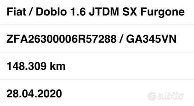 AUTOCARRO - FURGONE 2 posti - ITALIANO – TARGA : GA 345 VN ULTIMA FOTO ( una parte della nostra fattura d'acquisto ):ALLESTIMENTO -TELAIO – TARGA ITALIANA - KM - ANNO D'IMMATRICOLAZIONE TENUTO CON CURA - SEMPRE MANUTENZIONATO FIAT DOBLO’ cc1.6MJT 105 CV PROFESSIONAL , EURO 6 , APRILE 2020 con 148504 km REVISIONE DA FARE AD AGOSTO 2026 DUE CHIAVI Ottime condizioni generali interne, esterne e meccaniche Garanzia e possibilita' di finanziamenti agevolati. SI VALUTANO PERMUTE L'auto è disponibile a Sommatino ( CL ) in viale Fontaine 10 ( vicino la caserma dei carabinieri ) per qualsiasi vostra prova e controllo con meccanico di vostra fiducia . Non esitate a contattarmi per qualsiasi altra informazione alla mia email o direttamente al mio cellulare anche whatsapp PREZZO : 10400 euro – 1 ANNO DI GARANZIA CONFORMGEST SPA COMPLETA inclusa nel prezzo – PASSAGGIO DI PROPRIETA’ ESCLUSO