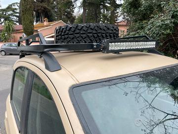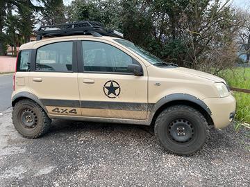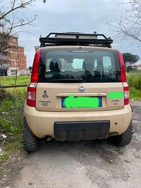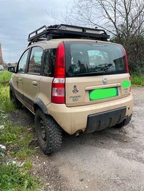 Fiat Panda 4x4, mod. 169, frizione e catena rifatte, autobloccaggio posteriore, gomme da sterrato, assetto rialzato non con spessori ma con molle speciali, ammortizzatori rinforzati anteriori e posteriori, barra led e serbatoio acqua potabile.