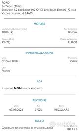Vendesi Ford Ecosport del 2018. Si consegna tagliandata e revisionata. GARANZIA 12 MESI CERTIFICATA UNICO PROPRIETARIOIDEALE PER NEOPATENTATI FINANZIABILE CARATTERISTICHE: Anno Imm. 10/2018 Carburante Benzina Potenza 73KW (99CV) Cambio Manuale Chilometraggio 67.000 km Scocca Monovolume, 5 Porte Tipo di dotazione 1.0 EcoBoost 100CV ST-Line Black Edition Consumo carburante 6l/100 km Categoria di emissione Euro 6 Colore Bianco Condizioni/Manutenzione Veicolo non incidentato, in buone condizioni NEOPATENTATI SI Revisione Da effettuare prima della consegna Dotazione ABS, Airbag, Airbag laterali, Airbag passeggero, Airbag per la testa, Airbag posteriore, Alzacristalli elettrici, Aria condizionata, Bluetooth, CD, Cerchi in lega, Chiusura centralizzata, Chiusura centralizzata con telecomando, Climatizzatore automatico, Computer di bordo, ESP, Fendinebbia, MP3, Radio, Sedile posteriore sdoppiato, Sensore pioggia, Servosterzo, Specchietti elettronici, Start/Stop automatico, Sterzo multifunzione, Vivavoce, Telecamera posteriore