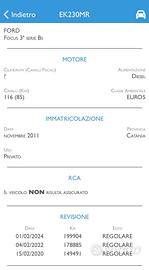 Salve vendo Ford Focus 1.6 TDCi 116 Cv S&S adatta alla guida per neopatentati e dai consumi bassissimi Anno 11/2011 con 220.000 Km..Auto come da foto..Motore in buone condizioni..Modello Full Optional è dotata di 4 alza cristalli elettrici..chiusura centralizzata..clima automatico bi zona..servo sterzo..computer di bordo..specchietti elettrici e richiudibili..stereo cd originale di serie con comandi multifunzionali al volante..sensori parcheggio sonori posteriori..vetri privacy posteriore..faretti fendinebbia..cerchi in lega ecc..