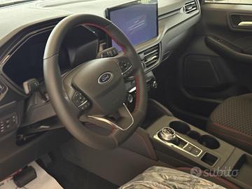 Luci ambiente di cortesia, Sedili anteriori con regolazione manuale 8 vie e supporto lombare, Sedili posteriori scorrevoli (avanti / indietro), Sedili sportivi comfort, Console centrale con Bracciolo portaoggetti, Cielo interno scuro, Tappetini anteriori e posteriori st-line, Sedili posteriori reclinabile 60:40, Volante a base piatta con impunture rosse, Climatizzatore automatico bi-zona, Clear exit assist, Eco Coach, Intelligent speed assistance (ISA), Modem 5g, Portellone posteriore Manuale, Tendina copri bagaglio, Keyless Entry - apertura e chiusura senza chiavi, Keyless Start - pulsante di accensione, Kit Riparazione Pneumatici, Griglia frontale e body styling kit st-line design, Modanature portiere nere, Rivestimento laterale inferiore in tinta carrozzeria, Alette Parasole Con Illuminazione, Chiusura automatica portiere posteriori (sicurezza bambini), Sospensioni standard, Sync 4, Supporto Per Ricarica Wireless, E-shifter: cambio con selettore rotativo, Cerchi in lega da 18" st-line rock metallic, Due Usb per seconda fila di sedili, Presa di alimentazione 12v vano bagagli, Paraurti posteriore in tinta, Retrovisori con regolazione elettrica, ripiegabili e riscaldabili con luci di cortesia, Retrovisori Esterni In Tinta Carrozzeria, Spoiler posteriore, Badge ST-Line, Barre longitudinali al tetto nere, Luci posteriori a LED, Fari abbaglianti automatici, Fari automatici con funzione follow me home, Fari anteriori livellabili, Fari Full LED con luci diurne a LED, Sedili in tessuto mira con impunture, Cruise Control, Pre collision assist - assistenza pre-collisione da telecamera frontale e sistema di frenata post-impatto, Driver Alert - monitoraggio stanchezza conducente, E-Call, BLIS - monitoraggio angolo cieco, Riconoscimento segnali stradali di velocità, Lane keeping system con road edge detection, Freno di stazionamento elettrico,