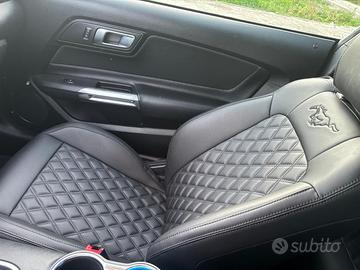 Interni in pelle nera trapuntata, logo Mustang sui sedili, inserti in carbon-look su plancia e bocchette. Cerchi originali Mustang con pinze rosse.