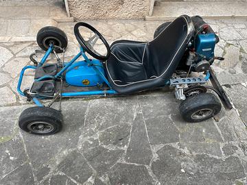 Vendo Go-kart anni 60 d'epoca, funzionante, come da foto, motore Guazzoni 100cc 2tempi. avviamento "a strappo", Carburatore, marmitta e pneumatici non originali. Probabilmente necessita di fare carburazione in pista e sostituire pneumatici.