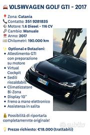 Vendo Volkswagen Golf 7.5 del 2017 in condizioni eccellenti, motorizzazione 1.6 diesel con cambio manuale. L’auto ha percorso 193.100 km ed è sempre stata tenuta con la massima cura, sia a livello estetico che meccanico.