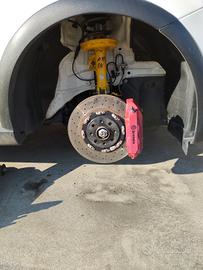Vendo grande punto abarth del 2008 preparata con td04 iniettori intercooler, collettori esseesse anticrepa con downpipe, viti camber sull'anteriore e piastre sul posteriore, barra posteriore nel baule assetto blisten b8 ritarato più rigido, dischi anteriori scomponibili flottanti, tubi freno in treccia, distanziali e cerchi fondmetal da 17, prese d'aria in carbonio sui fianchetti, plancia radio e clima in carbonio con bocchette forate per manometri, manometro temperatura egt con sonda, insieme do intercooler originale più un intercooler maggiorato e plancia radio e clima originale, frizione e volano appena sostituiti, di cruscotto segna 227000 km ma reali sono 100000, perché il motore è stato sostituito, la macchina di meccanica è perfetta, la carrozzeria ha bisogno di una rinfrescata perche ha qualche segno per via degli anni per info 3283895304