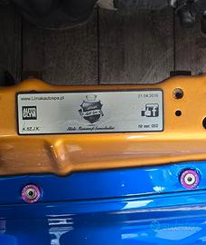 Lavoro di swap, assetto, freni e scarico effettuati da Limakcar, targa di certificazione presente su telaio.