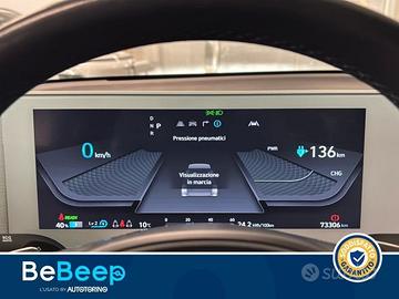 La vettura è completa nella dotazione optional di 2 Airbag a tendina, 2 Airbag anteriori, 2 Airbag laterali, 5 Anni Di Garanzia / Km Illimitati, Airbag centrale, Alzacristalli elettrici anteriori e posteriori, Antifurto Con Radiocomando A Distanza E Immobilizer, Attacchi ISOFIX, Caricatore di bordo da 10.5kW, Cavo di ricarica Modo 3, Cavo di ricarica di emergenza, Cerchi in lega leggera da 19"" con pneumatici 235/55 R19, Climatizzatore automatico bi-zona, Cluster SuperVision - Quadro strumenti LCD a colori ad alta definizione da 12.3"", Comandi audio al volante, Connessione Bluetooth con sistema di riconoscimento vocale, Cruise Control Adattivo con funzione Stop & Go (S.C.C.), Drive mode selector (Normal/Eco/Sport), Fari anteriori LED MFR, Fari posteriori LED, Freno di stazionamento elettrico con funzione autohold, Highway Driving Assist (H.D.A.), Kit Gonfiaggio Pneumatici, Luci diurne a LED, Maniglie a scomparsa in tinta carrozzeria, Paddle al volante per frenata rigenerativa, Poggiatesta anteriori regolabili in altezza, Presa ausiliaria 12V (plancia),