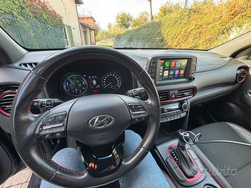 Bellissima Kona Hybrid/benzina bassi consumi, cambio semiautomacito con palette al volante, apple/android CarPlay, sensori e telecamera posteriore, sedili parzialmente in pelle nera con cuciture rosse, cinture e inserti rossi, colore carrozzeria canna di fucile metallizzata, cerchi in lega da 18 con gomme 4 stagioni hankook top di gamma.