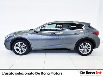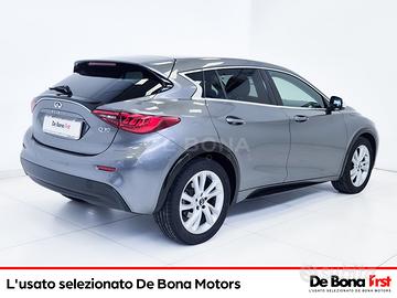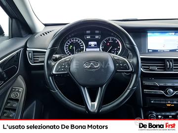 2 porte USB con connettivita smartphone e iPod, Airbag a tendina anteriori-posteriori, Airbag conducente e passeggero anteriore, Airbag protezione ginocchia conducente, Airbag protezione torace-bacino, Assistenza partenza in salita, Azionamento luci automatico, Chiusura centralizzata, Climatizzatore automatico con controllo bizona e bocchette posteriori nella consolle centrale, Controllo elettronico della frenata (EBD - Electronic Brake force Distribution), Cruise Control, Fari alogeni, Fari fendinebbia anteriori a LED, Fari posteriori a LED, Fendinebbia con finiture in nero laccato, Filtro antiparticolato DPF (disponibile solo sulle motorizzazioni diesel), Finitura cruscotto in ecopelle, Finiture dei terminali di scarico cromate, Finiture finestrini cromate satinate, Freno di stazionamento elettronico, Immobilizer, Inserti interni laccati neri, Kit di riparazione pneumatici, Lati spoiler tetto in nero laccato, Limitatore della velocita, Luci antipozzanghera sugli specchietti retrovisori esterni, Luci di marcia diurna a LED, Modanature passaruota in nero laccato, Poggiabraccio centrale anteriore, Pulsante modalita Eco (disponibile solo in combinazione con cambio a doppia frizione DCT), Punti ISOFIX di ancoraggio nel sedile posteriore, Regolazione in altezza del sedile conducente, Regolazione manuale dell'altezza e della profondita del piantone dello sterzo, Rete vano piedi passeggero anteriore, Riconoscimento vocale, Rivestimenti dei sedili in tessuto, Schienali dei sedili posteriori ribaltabili (con rapporto 40:60 e completamente), Sedili anteriori riscaldati, Selettore modalita di guida INFINITI (disponibile solo in combinazione con cambio a doppia frizione , Sensori Di Parcheggio Posteriori, Sistema adattativo di assistenza alla frenata, Sistema audio a 6 diffusori, Sistema audio AM/FM con lettore CD singolo, Sistema di allarme ad ult