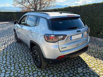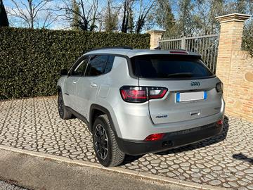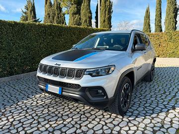 Jeep Compass 1.3 T4 PHEV 240Cv Trailhawk 4xe-Low-Lock (4x4) HybridPlug-in Automatico/Seq 132Kw (motore termico) - 44Kw (motore elettrico), immatricolazione 30.06.2021, Euro 6D-Isc-Fcm - CO2: 00047,colore Glacier con protettori intorno parte bassa carrozzeria / barre tetto / monadaturaintorno vetri porte e specchi nero opaco, vetri oscurati, fanali e luci diposizione a Led, fendinebbia, cerchi in lega, autovettura uso proprio 5 postiinterno combinazione pelle nera / tela grigio scuro con cuciture rosse, selettoreguida Auto / Sport / Snow / San Mud / Rock – selettore 4Wd Low / 4Wd Lock, selettoreHybrid – Electric – E-Save, sedile conducente con posizionamento lombare, bracciolocentrale anteriore / posteriore, volante in pelle, freno a mano comando elettrico,Traffic Sign Recognition, anti crash (radar) con frenata d’emergenza, selettoreparking assist (parcheggio automatico), chiusura chiavi con transponder,control cruise comandi volante e selettore ACC, impianto Multimedia SoundSystem Alpine con schermo touchscreem Radio / Media / Clima / Apps / Nav(TomTom) / Phone / Settings comandi volante, Apple CarPlay, bluetooth comandivolante e vocali, ESP, ABS, airbag, sidebag, 4vetri ed specchi richiudibili comandielettrici, pc bordo, Lane Assyst, sensori di parcheggio anteriori / posteriori etelecamera per parcheggio assistito 360°, sensore luce / pioggia, climatizzatoreautomatico, sedili posteriori sdoppiabili con appoggiatesta e copri bagagliaio, provvista di gomma di scorta, 74.814Km,tagliandato chilometri certificati .
