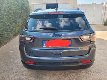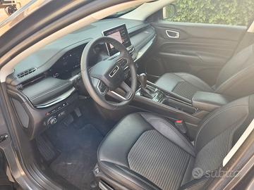 pacchetto estetico "Gloss Black" (cerchi, calotte), comfort come clima bi-zona, Keyless Go, Uconnect 8.4" con Apple CarPlay/Android Auto, e sicurezza avanzata con Lane Support, Forward Collision Warning e frenata d'emergenza, più dettagli ibridi come il cavo di ricarica Mode 2, il quadro strumenti TFT configurabile da 10.25" e sedili in tessuto/Tecno Vinyl