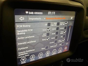 ACCESSORI: cerchi in lega 17'' razze a Y, paraurti specifici, spoyler post.re, mancorrenti longit. al tetto neri, fari fendinebbia, luci diurne, retrovisori esterni regolab. elettr., climatizzatore autom. bizona, radio Uconnect touchscreen da 8.4'' (con radio DAB, connettività per smartphone e vivavoce bluetooth), ingr. usb, sensore luci e pioggia, volante sportivo in pelle multif., Adaptive Cruise Control, airbags, abs, esc tcs, Hill Start Assist, Lane departure warning plus, Forward collision warning plus, Traffic sign Assist, freno di stazion. elettr., 4 vetri elettr., sedili in tessuto Premium, modanature interne Metal Diamond.