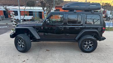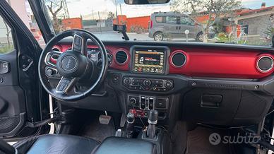 Jeep Wrangler Rubicon motore 2.2 EcoDiesel; 81 L di serbatoio; consumo medio 10.1l/100km; kit parafanghi con frecce led; rialzata e assi allargati; ammortizzatori Fox; paraurti ad uso gravoso posteriore e anteriore; verricello telecomandato con corda in fibra; impianto audio Alpine; sedili in pelle; hard top rimovibile; carplay e android auto.