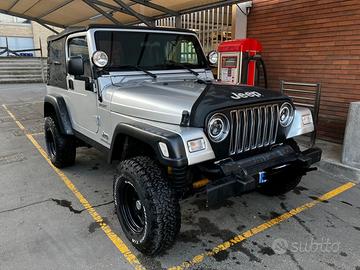 Jeep wrangler tj cilindrata 2.4 benzina, 105 kw 143 Cavalli, 4 posti, 3 porte, cambio manuale a 6 rapporti, trazione posteriore e 4X4 inseribile, rialzata con kit old man emu, soft top della best top e hard top, disponibili 4 cerchi originali e i fari originali, impianto gpl con sostituzione serbatoio da 45 litri il 24.04.2024.