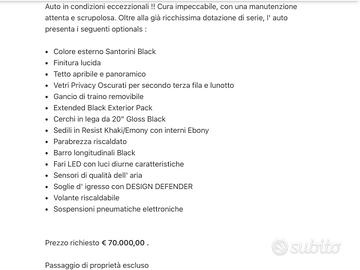 BUONGIORNO. TSA GROUP AUTOMOTIVE . VI PROPONE LAND ROVER DEFENDER 3.0 DIESEL / ELETTRICA . CV 300 . FULL OPTIONAL . NAVI . PELLE TOTALE . TETTO PANORAMICO APRIBILE. GANCIO TRAINO .SUV PERFETTA . NESUN INTERVENTO DA FARSI . TAGLIANDATA . TAGLIANDI CERTIFICATI. X INFORMAZIONI DETTAGLIATE DISPONIBILITÀ E VISIONE GRADITO APPUNTAMENTO CONTATTARE ORARI UFFICI . O LASCIARE VS RECAPITO TELEFONICO O E-MAIL SARETE RICONTATTATI DA NS STAFF COMMERCIALE. VISITA NS SHOP X PARCO AUTO .