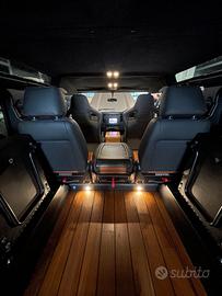Interni in pelle con sedili anteriori Recaro, sedili posteriori abbatttibili singolarmente e removibili,cielo in alcantara con illuminazione interna led, pavimenti in parquet Teak di alta qualità.