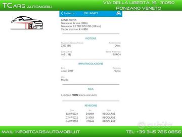 Ci trovi a Ponzano Veneto in via della Libertà 16 TCARS. T-CARS: Andrea: 3 4 5 7 8 6 0 8 5 6 Aron: 3 9 2 4 0 4 7 5 6 4 Anna: 3 3 1 3 6 0 0 4 2 2 Simone: 3 5 1 7 8 6 6 5 0 6 TRAZIONE INTEGRALE TETTO APRIBILE Auto in ottime condizioni generali Anno: 07/2007 Modello: FREELANDER 2 HSE Cilindrata: 2.2 - 118 KW - 160 CV Cambio: MANUALE Alimentazione: DIESEL KM ATTUALI: 262.000 Revisione valida fino: 07/2026 Distribuzione: SOSTITUITA A 212.000 KM NEL 2022 Nessun problema di carrozzeria. Nessun problema di meccanica. Passaggio di proprietà in agenzia di fiducia. No perditempo. Massima serietà. Garanzia 12 mesi FULL con un contributo Telefona sempre per un appuntamento, per verificare la disponibilità della vettura e per confermare tutte le caratteristiche pubblicate nella descrizione. TEST DRIVE SU APPUNTAMENTO. NOTA BENE: TUTTE LE INFORMAZIONI DESCRITTE POSSONO ESSERE SOGGETTE A ERRORI E NON COMPORTANO IN ALCUN MODO OBBLIGO CONTRATTUALE. VERIFICA SEMPRE TUTTI I DATI. DAL LUNEDI AL VENERDI: 08:30 - 12:30 / 15:00 - 19:00 SABATO: 09:00 - 12:00 / 15:00 - 18:00 DOMENICA: CHIUSO