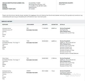-VETTURA IN ARRIVO-TURBINA E FAP NUOVI SOSTITUITI IN RANGE ROVER NEL 2025 -Tutte le nostre autovetture o fuoristrada dispongono di libretto SERVICE e chilometraggio certificato originale se consegnatoci dal proprietario precedente. -Le nostre vetture godono di Garanzia a partire da 12 mesi. La garanzia OPTAVEN ti permetterà di guidare la tua nuova vettura in tutta tranquillità. Le nostre coperture, superiori agli standard di mercato, raggiungono il livello di protezione paragonabile a quello offerto dalla Garanzia della cosa costruttrice. -Offriamo finanziamenti e leasing a tassi agevolati. -Si valuta ogni tipo di permuta. N.B. La società venditrice non assume alcuna responsabilità relativamente ai dati della vettura riportati nel sito, avuto particolare riguardo agli optional che debbono considerarsi puramente indicativi essendo il sito in continuo aggiornamento. Invitiamo i nostri clienti a prendere contatto telefonico per la verifica delle caratteristiche della vettura. ABS Airbag laterali Antifurto Chiusura centralizzata Airbag per la testa Riconoscimento segnali stradali Monitoraggio angolo cieco Fari adattativi Riconoscimento pedone Isofix Chiusura centralizzata senza chiave Immobilizzatore elettronico Trazione integrale Airbag guida Airbag passeggero Controllo elettronico della stabilità Controllo elettronico della trazione Airbag per le ginocchia Controllo automatico adattivo della velocità Fari anteriori a LED Frenata automatica di emergenza Airbag posteriore Controllo elettronico della corsia Luci diurne LED Sistema di controllo pressione pneumatici Luci diurne Appoggiatesta posteriori Climatizzatore Correttore assetto fari Sedili regolabili elettricamente Volante regolabile Interni in materiale pregiato Sensore luci Hill Holder Controllo automatico clima Porta scorrevole Cambio automatico Controllo automatico velocità Indicatore temperatura esterna Retrovisori elettrici Retrovisori ripiegabili ele