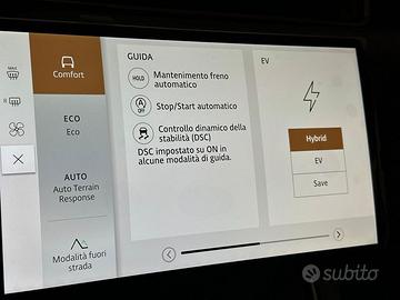 DEK:[9370287] Vettura con tecnologia PLUG-IN HYBRID ELECTRIC VEHICLE (PHEV), classificata "IBRIDA" sul libretto di circolazione. IVA ESPOSTA Garanzia ufficiale JAGUAR LAND ROVER fino a marzo 2030 o al raggiungimento di 150.000 km Fra la ricca dotazione distinguiamo: 017FI Convenience Pack 030NT Fari abbaglianti automatici (AHBA) 070AV Apertura portellone posteriore elettrica 029FJ Sistema Riparazione Gomme Land 039LA Cerchi in lega da 19" "Style 5136" Gloss Dark Grey con finitura a contrasto Diamond Turned 047DB Vetri oscurati 188KA Cavo di ricarica domestica 500AK Black Exterior Styling Pack 020BK Pinze freno Nere 074LN Black Exterior Pack VENITE A SCOPRIRLA PRESSO I NOSTRI SHOW-ROOM! (La SOLUZIONE SpA declina ogni responsabilità per eventuali involontarie incongruenze, che non rappresentano un impegno contrattuale.)