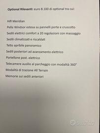 Optional Rilevanti: euro 8.100 di optional tra cui: Hifi Meridian, Pelle Windsor estesa su pannelli porte e cruscotto, Sedili elettrici comfort a 20 regolazioni con massaggio, Sedili climatizzati e riscaldati, Tetto apribile panoramico, Sedili posteriori ad avanzamento elettrico, Portellone post. elettrico, Telecamere ausilio al parcheggio con modalità 360°, Modalità di trazione All Terrain, Memorie sui sedili anteriori
