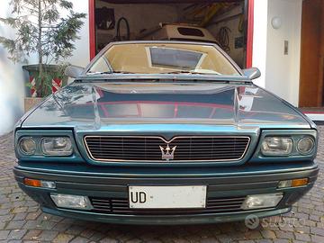 Vendo Maserati 2.24v modello restyling anno 1992, bicolore verde micalizzato – blu ischia, interni in radica di olmo e pelle e alcantara color ghiaccio, iscritta ASI con CRS, catalizzata a norma Euro 1, km 97.000, tutta originale, targa UD di prima immatricolazione, condizioni perfette di meccanica, interni e carrozzeria, tenuta sempre in garage coperto, manutenzione regolare presso Candini di Modena con relative fatture, appena tagliandata e revisionata, compreso controllo della pressione delle turbine e sostituzione della cinghia, batteria nuova, gomme nuove, climatizzatore automatico, sospensioni attive, completa di trousse attrezzi e portadocumenti originale con libretto di uso e manutenzione. Compreso nel prezzo anche centrale di scarico libero. NO PERMUTE