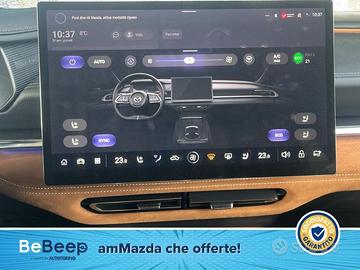 Vano portaoggetti anteriore floccato, Sedile guidatore elettrico 10 vie, Sedile passeggero elettrico 4 vie, Sedili anteriori riscaldabili e ventilati, Rivestimento cielo nero, Volante riscaldabile elettricamente, Divano posteriore abbattibile 60:40, Volante bi-colore, Climatizzatore automatico bi-zona con purificatore e ionizzatore pm2.5, Aggiornamenti cloud, Door opening warning dow, Intelligent speed assist isa, Porte senza cornice con maniglie a scomparsa, Pompa di calore, Sensori parcheggio anteriori e posteriori, Servizi connessi mazda app, Volante multifunzione pelle artificiale con paddle shift, Smart key, On-board charger trifase 11kw, Griglia anteriore con firma luminosa, Inserti interni legno, Smartphone bluetooth digital key,
