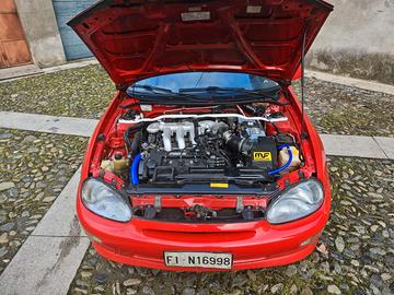 Tettuccio elettrico apribile, interni in condizioni eccellenti, autoradio 2 din. Tagliando appena eseguito: (olio filtro olio candele liquido refrigerante, filtro benzina), cuffie giunti omocinetici nuove, radiatore nuovo, collettore di aspirazione rigenerato (gommini e pulizia condotti) sostituiti manicotti raffreddamento con tubi siliconici, sensore massa aria sostituito , spinterogeno sostituito, batteria nuova, gomme con 1 anno di vita. Attualmente monta cerchi MIM, ma sono disponibili i suoi cerchi originali Mazda gommati al 60%.