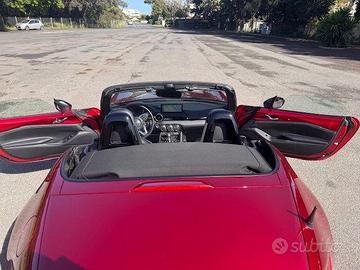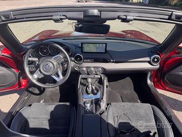 Mazda MX-5 2.0 ND Homura colore RedSoul, con soli 4.500 km, un vero "fine serie" da collezione che rappresenta l'apice della quarta generazione della spider più venduta al mondo. Versione 2.0L da 184 CV (Immatr. Set 2024) in allestimento Homura e colorazione RedSoul, è un classico sempre più raro da trovare: un'opportunità per possedere la Miata definitiva nella configurazione più prestazionale e ambita, nella sua forma più matura e pura prima delle future evoluzioni. Con 4.500 km, l'auto è praticamente nuova, da considerarsi in condizioni di rodaggio terminato, praticamente "pari al nuovo". Coperta dalla Garanzia ufficiale Mazda di 6 anni. • Colore Iconico: Soul Red Crystal. Non è semplice vernice, ma un processo brevettato a tre strati che crea una profondità e una riflessione della luce ineguagliabili, esaltando le linee Kodo. • Allestimento Homura: Rappresenta il top della gamma per gli appassionati: motore aspirato 2.0 Skyactiv-G da 184 CV, con cambio manuale a 6 rapporti. Include sedili sportivi Recaro in pelle e Alcantara, freni Brembo maggiorati, barre duomi, sospensioni Bilstein e cerchi in lega BBS forgiati da 17" in nero lucido. • Fine Serie (ND3/2024): beneficia degli ultimi aggiornamenti (restyling 2024), tra cui nuovi fari LED, un sistema di infotainment da 8.8 pollici più moderno, supporto Apple CarPlay/Android Auto wireless, volante regolabile (altezza/profondità), una nuova modalità "DSC Track" per il controllo di stabilità, differenziale autobloccante. Accessori aggiuntivi (valore 6k€): - Pellicola PPF protezione carrozzeria (parte frontale) - Kit assetto sportivo (molle ribassate Eibach e distanziali ruote) - PedalBox (riposta più pronta del gas fin dai bassi regimi) - Frangivento trasparente Mazda (maggiore protezione) - Terminale + centrale di scarico Fox omologati (sound sportivo e avvolgente) - Tromba bitonale e Antenna radio corta tipo Stubby - Doppio telo (tessuto rosso morbido elasticizzato e antipioggia felpato)