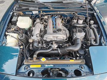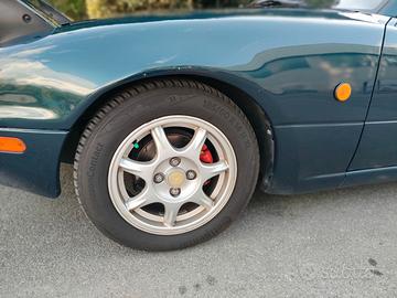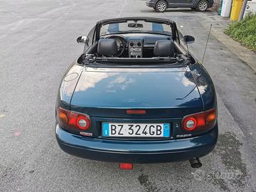 Mazda MX-5 NA 1.6 90cv – Montego Blue – ASI – 128.000 km Vendo la mia Mazda MX-5 NA, 1.6 da 90cv, cambio manuale, colore Montego Blue con interni in nero. Auto iscritta ASI (Automotoclub Storico Italiano) con i relativi vantaggi fiscali e assicurativi. Auto tenuta con grande cura, sulla quale ho eseguito tutti i principali interventi preventivi con ricambi di qualità. Interventi eseguiti: Ammortizzatori Kayaba + molle Eibach Dischi anteriori baffati EBC + pastiglie Yellowstuff Flessibili freno anteriori nuovi Termostato originale Mazda + liquido refrigerante + sensore temperatura acqua Stack Capote nuova con lunotto in vetro riscaldabile, cablaggio e componenti originali Mazda Kit frizione completo + olio cambio + paraolio albero motore Cinghia accessori + candele NGK Filtro olio, aria e benzina + tiranti barra stabilizzatrice anteriore Condizioni generali: Carrozzeria in buone condizioni con qualche graffietto dovuto alla normale usura. Interni in ottimo stato. Capote nuova perfettamente funzionante con lunotto riscaldabile. Motorino alzacristallo lato guida da sostituire. Aria condizionata presente (impianto certificato Mazda, installato post produzione) ma non verificata, ceduta nello stato attuale. Provenienza italiana documentata, sempre in Liguria e Nord Italia. Sempre tenuta in garage al chiuso. Modifiche: Volante Sabelt di diametro ridotto (ideale per chi è alto) Scarico con terminale M2 + dbkiller incluso Accessori e materiale a corredo: 2 chiavi originali Volante originale Ammortizzatori e molle originali (da revisionare) Ruota di scorta originale con cric e kit di montaggio originali Radio 1 DIN Scatola ricambi fusibili Tutto il materiale è incluso nella vendita, ad eccezione dello scarico originale.