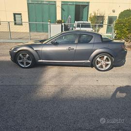 Appassionante sportiva Wankel MAZDA RX 8 1300 modello V9 , MOTORE NUOVO con fattura dalla fabbrica, anno 2006 già iscrivibile ASI per riduzione del bollo - interno in pelle totale - sedili riscaldati - autoradio con MP3 e raccoglitore CD - FRIZIONE completa nuova con sostituzione del cambio revisionato a nuovo - CERCHI in lega da 18 con pneumatici 225/45/18 al 90 % - POTENZA motore 230 cc 170 Kw - ABS - SERVOSTERZO- CHIUSURA CENTRALIZZATA- CLIMA AUTOMATICO - 4 posti . Presenta alcuni strisci sulla carrozzeria.