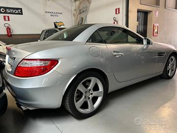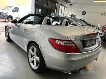 Mercedes-Benz SLK 200 (cgi be) Premium cabriolet, un'auto elegante e sportiva perfetta per godersi la guida a cielo aperto. Questa vettura è di colore argento con interni in tessuto nero, dotata di due posti e due porte. Il motore è un 4 cilindri da 1796 cc con trasmissione automatica a 7 marce e una potenza di 184 CV. Consuma mediamente 6,4 litri per 100 km e rientra nella classe di emissioni E5.