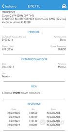 Salve vendo stupenda Mercedes C220 CDi 170 Cv Anno 2011 con 140.000 Km..Unico Proprietario..Revisionata..Gommata al 70% è dotata di Doppie Chiavi..Auto in ottime condizioni generali e non necessita di alcun intervento..Motore è Meccanica in perfette condizioni..Interni senza alcun segno di usura..Modello Full Optional è dotata di 4 alza cristalli elettrici..chiusura centralizzata..clima bi zona..servo sterzo..computer di bordo..volante è sedili regolabili in altezza..specchietti elettrici è richiudibili..stereo cd originale di serie con comandi multifunzionali al volante e collegamento telefonico bluetooth..sensori luce è pioggia..sensori parcheggio sonori anteriori è posteriori..fari lenticolari..faretti fendinebbia..cerchi in lega ecc..