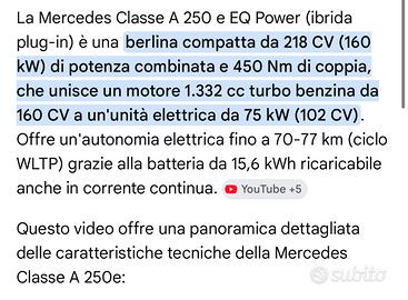 MERCEDES CLASSE A 250e HYBRID EQ-POWER CAMBIO AUTOMATICO 8 RAPPORTI motore conbinato con 218 cv ANNO 2020 KM 100.00 EURO appena tagliandata DISPONIBILI DOPPIE CHIAVI VETTURA ECCEZIONALE PARI AL NUOVO SUPER ECONOMICA CON OTTIMI PRESTAZIONI CAMBIO AUTOMATICO CON MODALITÀ DI GUIDA CONFORT, SPORT, INDIVIDUAL, ELETRICO PALETTE F1 VOLANTE IN PELLE MULTIFUNZIONE DISPLAY CENTRALE TOUCH SCREEN NAVIGATORE AUX/USB/BLUETOOTH/VIVAVOCE CLIMA AUTOMATICO CRUISE CONTROL LIMITATORE DI VELOCITÀ CRISTALLI ELETTRICI START&STOP MANTENIMENTO DELLA CORSIA FRENATA DI EMERGENZA RADAR ANTICOLLISIONE RICONOSCIMENTO CARTELLI STRADALI TELECAMERE 360'RETROCAMERA POST FARI FULL LED BIXENON SENSORI PARCHEGGIO ANT/POST SENSORI LUCI/PIOGGIA SPECCHIETTI ELETTRICI VETRI POST PRIVACY PACCHETTO ESTETICO ESTERNO NERO LUCIDO CERCHI IN LEGA 18 POLICI CHIUSURA TETTO APRIBILE PANIRAMICO… CONTATTARE SOLO SE REALMENTE INTERESSATI! Cedo anche il cavo di ricarica Accetto eventiale permuta con auto di pari valore