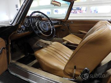 Sedili e pannelli in MB Tex color Cognac cod. 2402, Moquette al pavimento in bouclet havana, Autoradio Blaupunkt dell’epoca con antenna elettrica al parafango anteriore destro, Specchio esterno lato guida cromato, Cerchi in ferro cromati con calotta Mercedes-Benz verniciati in tinta carrozzeria con pneumatici Michelin 185HR14 con bordo in rilievo salva marciapiede, Soft top in tela marrone 737, Hard top in tinta carrozzeria, Staccabatteria