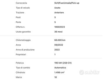 TOP SALES AUTOMOTIVE GROUP . VISITA NS SITO WEB TOPSALESAUTOMOTIVE.COM X NUOVE OFFERTE ( 150 AUTO DISPONIBILI ) VISITA NS SHOP AUTO SUBITO .IT X NUOVE OFFERTE ( 35 AUTO DISPONIBILI ) . MG EHS PLUG -IN HYBRID EXCLUSIVE . ELETTRICA / BENZINA . AUTOMATICA .SUV PERFETTA . 258 CV . NESUN INTERVENTO DA ESEGUIRE. TAGLIANDATA . TAGLIANDI CERTIFICATI . FULL OPTIONAL . VEDI DATI COMPLETI ALLEGATI . PER OGNI INFORMAZIONE DETTAGLIATE CONTATTARE ORARI UFFICIO NS STAFF COMMERCIALE. O LASCIARE VS RECAPITO TELEFONICO O E-MAIL SARETE RICONTATTATI A BREVE . TOP SALES AUTOMOTIVE GROUP . ABS Airbag laterali Antifurto Chiusura centralizzata Fendinebbia Pretensionatore cinture Airbag per la testa Riconoscimento segnali stradali Monitoraggio angolo cieco Fari adattativi Riconoscimento pedone Isofix Chiusura centralizzata senza chiave Immobilizzatore elettronico Sistema di chiamata d'emergenza Sistema di riconoscimento della stanchezza Airbag guida Airbag passeggero Chiave con transponder Controllo elettronico della stabilità Immobilizzatore Controllo elettronico della trazione Airbag per le ginocchia Controllo automatico adattivo della velocità Fari anteriori a LED Avviso del cambio di corsia Frenata automatica di emergenza Airbag posteriore Controllo elettronico della corsia Luci diurne LED Sistema di controllo pressione pneumatici Sistema di visione notturna Luci diurne Appoggiatesta posteriori Climatizzatore Correttore assetto fari Lavatergifari Retrovisori elettrici termici Ricircolo aria Sedili regolabili elettricamente Sospensioni autoregolabili Tetto apribile Vetri elettrici anteriori Volante regolabile Interni in materiale pregiato Vernice metallizzata Sensore luci Tetto panoramico Hill Holder Controllo automatico clima Sospensioni pneumatiche Volante in pelle Leve al volante Interni in pelle Cambio automatico Controllo automatico velocità Indicatore temperatura esterna Retrovisori elettrici Retrovisori ri