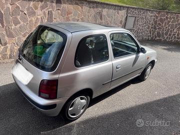 Nissan Micra colore grigio metallizzato chiaro, anno 1996, euro 2, cilindrata 1.3, potenza 55 kW, 3 porte, tettino panoramico apribile, aria condizionata, impianto stero con casse sul pannello posteriore. Alimentazione a Benzina e GPL (prossimo cambio bombola GPL nel 2033), la revisione scade il 30 ottobre 2027, il bollo scade il 31 agosto 2026, dal prox anno non si paga più il bollo ma solo una tassa di circolazione forfettaria (circa 25/30 euro l’anno). Tagliandata Nissan, 211.000 km, custodita sempre in garage, gomme seminuove, tappezzeria originale in ottimo stato, usura del tempo. No perditempo