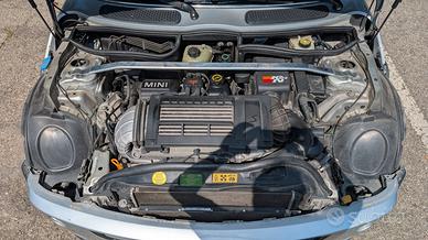 MINI R53 pre rest con numerose modifiche, in mio possesso dal 2019, auto stradale utilizzata anche in pista e come "ZERO CAR" per alcune competizioni. Ciclistica: assetto Tein Street Advance Z, barre whiteline posteriore e anteriore, barra duomi in alluminio, boccole powerflex sui bracci anteriori. Freni: dischi e pastiglie posteriori cambiati nel 2024, anteriore maggiorato mono pompante 294mm con disco baffato e pastiglie EBC blu (fornisco anche gialle usate) tubi in treccia su tutti e 4 i freni. Motore e trasmissione: nel 2024 sono stati cambiati frizione e volano monomassa, guarnizioni di coppa, scambiatore, portafiltro, coperchio valvole, supporto motore inferiore e superiore, ventola radiatore, cambiata la pompa acqua, revisionato interamente il volumetrico e montata una puleggia -15%cravenspeed + cinghia, con leggera mappatura, nel 2025 cambiata la pompa dell'idroguida, monta un filtro aria in cotone a pannello K&N, scarico "one ball" collettori e catalizzatore originali. Vendo con doppio set di cerchi estivo AZEV A 16 x 7,5 (come da foto) con montate Nankang ns2r e set invernale 16 x 6.5 con gomme da neve. Doppie chiavi e chiave da "portafoglio" Difetti: trasudo di olio presumibilmente derivante da una delle guarnizioni delle pulegge motore, uno dei supporti in gomma che tengono la barra antirollio anteriore cigola poiché secco (ininfluente sul comportamento di guida), carrozzeria ed interni da rivedere, numerosi graffi e strisciate, manca il rivestimento del cielo, alcuni piccoli strappi sul sedile dovuti all'uso. Cedo numerose parti originali (impianto frenante, faretti supplementari ecc) Macchina usata, sicuramente non perfetta ma sempre correttamente manutenuta.