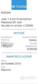 BELLISSIMA!!! NISSAN JUKE-1,5 dCi- START&STOP PREMIUM PURE DRIVE- UNICA PROPRIETARIA-FOTO ULTIME 3 REVISIONI- EURO 6B. - KM 95000 "ASSOLUTAMENTE O-RI-GI-NA-LI". FATTURE DEI LAVORI E DELLE REVISIONI- NIENTE TARGHE NASCOSTE!! QUALSIASI VERIFICA. SE RICHIESTO INVIO COPIA LIBRETTO CIRC. - FOTO ULTIMA REVISIONE FATTA LI 09-2024 A KM 89000. CARROZZERIA TAPPEZZERIA E MECCANICA IN OTTIME CONDIZIONI. TAGLIANDO OLIO E FILTRI APPENA FATTO- INIETTORI NUOVI- Cilindrata 1500, KW 81- CV 110. TELECAMERA POST-NAVIGATORE, CRUIS CONTROL, CLIMATIZZATORE AUTOMATICO, ABS, AIRBAG, COMANDI AL VOLANTE IN PELLE, RADIO CD CON AUX-USB-BLUETOOTH, COMPUTER, HILL HOLDER, sistema elettronico, gestito dall'ESP, che assiste automaticamente il guidatore nelle partenze in salita, BRACCIOLO ANT.- SPECCHI ESTERNI ELETTRICI E RICHIUDIBILI, VETRI POST. OSCURATI, 4 ALZAVETRI ELETTRICI, TELECOMANDO APRIPORTA E 2' CHIAVE, START&STOP, AVVIAMENTO CON PULZANTE, ("D Mode" è un sistema che consente di selezionare diversi stili di guida, adattando la vettura alle esigenze del conducente. Le modalità disponibili sono "Eco", "Standard" e "Sport", ciascuna modificando l'assetto della vettura in termini di reattività, sterzo e cambio) SEDILE GUIDA REGOLABILE IN ALTEZZA, FARI LED, SEDILE POSTERIORE SDOPPIABILE, SENSORI PRESSIONE GOMME, CERCHI IN LEGA DA 18' CON GOMME ESTIVE SEMINUOVE. ----(KEYLESS, il sistema di apertura e avviamento senza chiave che permette di aprire le portiere dellauto, inoltre quando ci fermiamo possiamo spegnere il motore attraverso il pulsante ed uscire con la chiave in tasca mentre le portiere si chiudono con un semplice tocco sulla maniglia esterna semplicemente premendo sul pulsante)----- Interni molto curati, Igienizzati Professionalmente, Non Fumatore, scrupoloso controllo generale prima della consegna, 1 ANNO DI GARANZIA, QUALSIASI PROVA, TUTTA FINANZIABILE. La Nostra Attivita' ci coinvolge con una grande passione ultratrentennale. Facilmente Raggiungibili a 1km dall'uscita Tolen
