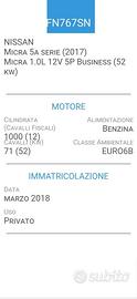 BELLISSIMA!!! NISSAN MICRA 1,0 BUSINESS- EURO 6B- UNICA PROPRIETARIA - FOTO ULTIME 2 REVISIONI- BOLLATA FINO AL 01-2027- OK NEOPATENTATI ( Frenata d'Emergenza Intelligente (FEB) che utilizza radar e telecamere per rilevare ostacoli, veicoli o pedoni, riducendo il rischio di collisioni, il sistema monitora la strada davanti a velocità superiori a 5 km/h, inviando segnali d'avviso visivi e acustici in caso di pericolo imminente). KM 58000 ( ha percorso circa 6000 km all'anno!! "ASSOLUTAMENTE O-RI-GI-NA-LI" NIENTE TARGHE NASCOSTE!! QUALSIASI VERIFICA. SE RICHIESTO INVIO COPIA LIBRETTO CIRC. FOTO ULTIMA REVISIONE FATTA LI 03-2024 A KM 37000 ( l'auto verra' consegnata con la nuova revisione) -FOTO ULTIMO TAGLIANDO VALIDO FINO A KM 75000- CARROZZERIA TAPPEZZERIA E MECCANICA IN OTTIME CONDIZIONI. Cilindrata 1000 KW 52-CV 71 - Limitatore di velocità e Cruise Control, il primo impedisce di superare una velocità impostata pur gestendo l'acceleratore, ideale in città o zone con tutor. Il Cruise Control mantiene costante la velocità selezionata automaticamente, ottimo per lunghi viaggi autostradali, riducendo la fatica, CLIMATIZZATORE, ABS, AIRBAG, COMANDI AL VOLANTE IN PELLE, RADIO, CD, AUX-USB E TELEFONO BLUETOOTH DI SERIE, COMPUTER, HILL HOLDER, sistema elettronico, gestito dall'ESP, che assiste automaticamente il guidatore nelle partenze in salita, START&STOP, LUCI AUTOMATICHE, ALZAVETRI ELETTRICI, SPECCHI ESTERNI ELETTRICI, N.2 TELECOMANDI APRIPORTE, SEDILE POST. SDOPPIABILE, ISOFIX, BATTERIA SOSTITUITA LI 12-2023- CERCHI IN LEGA DA 16', GOMME SEMINUOVE. Interni molto curati, Igienizzati Professionalmente, Non Fumatore, scrupoloso controllo generale prima della consegna, 1 ANNO DI GARANZIA, QUALSIASI PROVA, TUTTA FINANZIABILE. La Nostra Attivita' ci coinvolge con una grande passione ultratrentennale. Facilmente Raggiungibili a 1km dall'uscita Tolentino Ovest della superstrada Civitanova Marche - Foligno. a 5 min dalla Stazione FFSS di TOLENTINO.